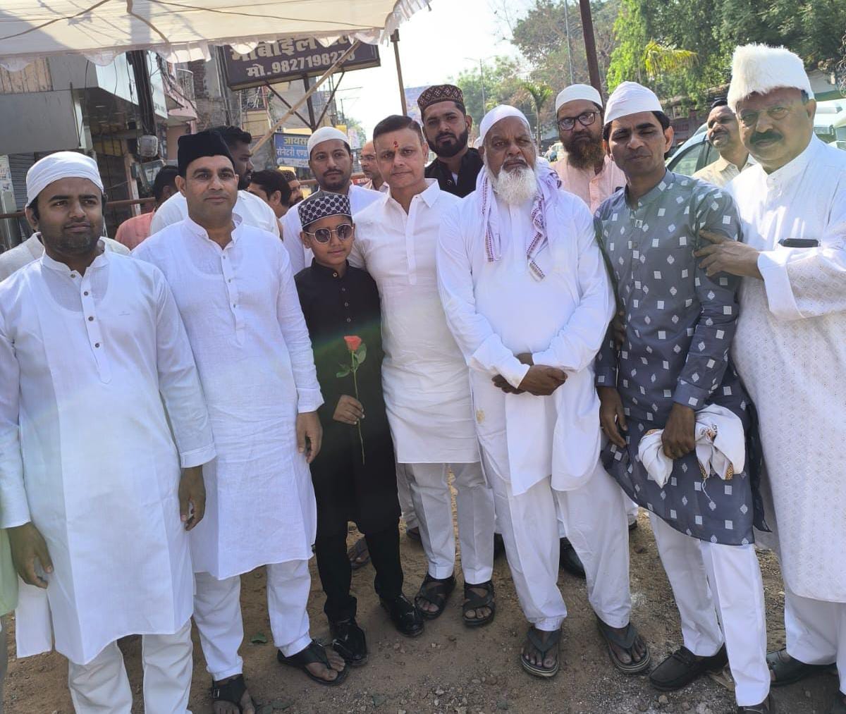 गंगा-जमुनी तहज़ीब की मिसाल पेश करते हुए नगर पालिका अध्यक्ष श्री अश्वनी शर्मा ईदगाह पहुंचे और मुस्लिम समाज के लोगों को गुलाब का फूल भेंट कर ईद की हार्दिक शुभकामनाएं दीं। इस अवसर पर उन्होंने कहा कि ईद का त्योहार समाज में प्रेम, एकता और भाईचारे को मजबूत करने का संदेश देता है।